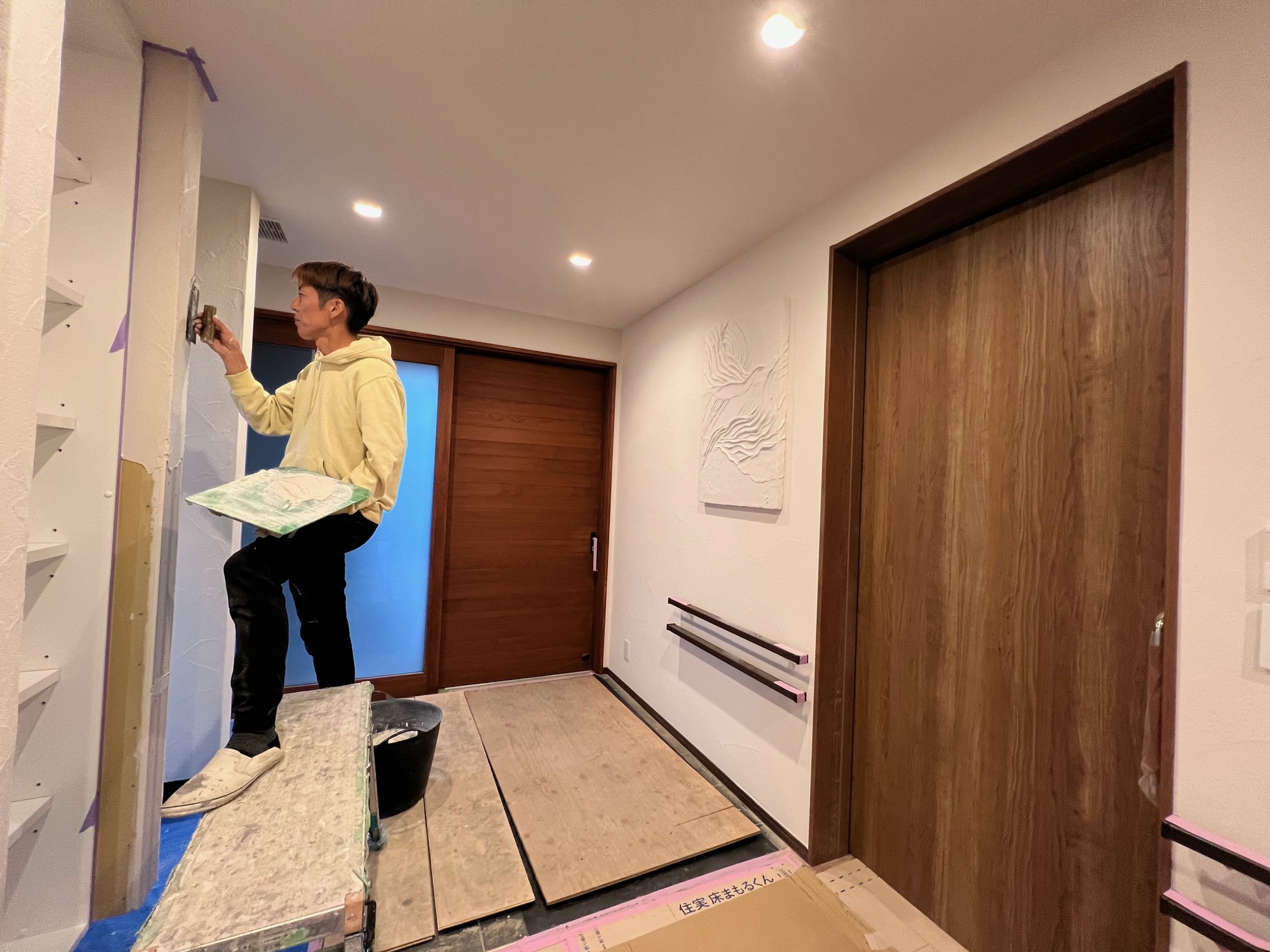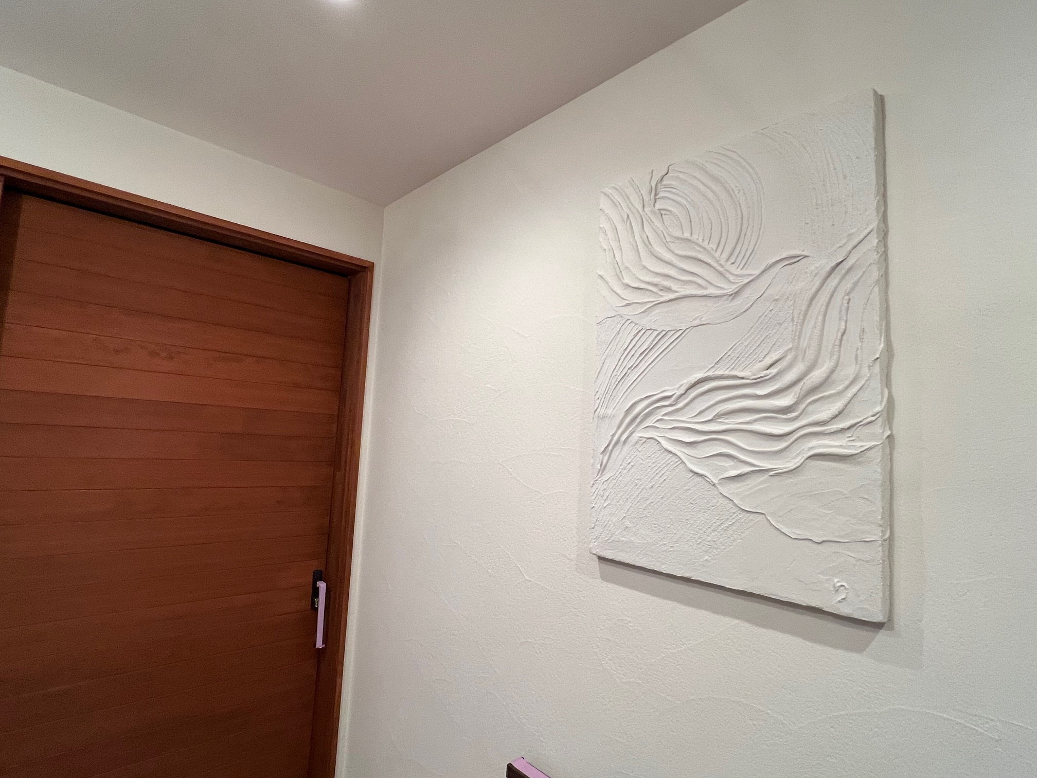 建築中の自宅の壁も漆喰のため漆喰の上に漆喰のアート作品が